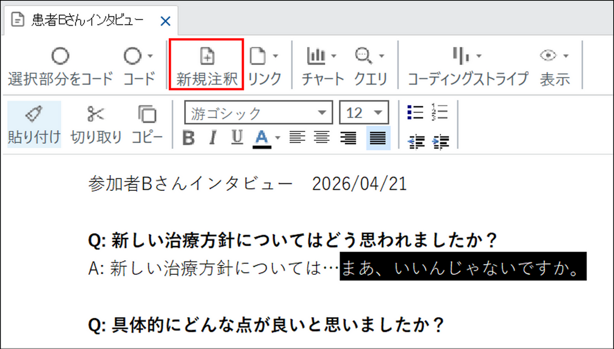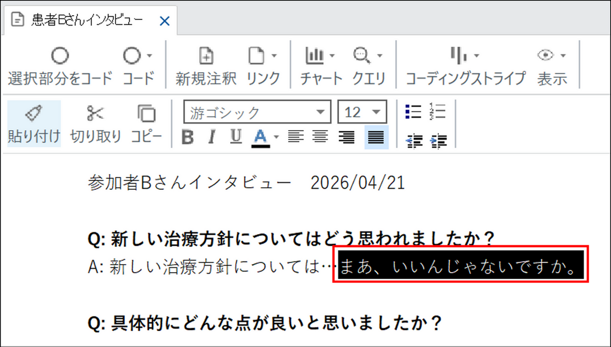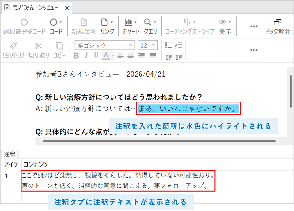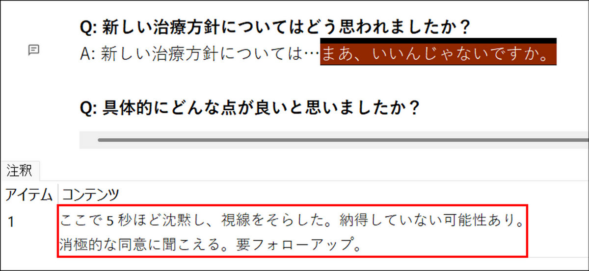 この場面では、「まあ、いいんじゃないですか」というテキストを選択し、「ここで 5 秒ほど沈黙し、視線をそらした。納得していない可能性あり」と注釈を残します。このようにテキストだけでは伝わらない非言語のニュアンスや、後で定義を確認すべき単語などをマークしておくことで、コーディングや再分析の際にデータの文脈をより正確に捉えることができます。コーディング済みの範囲に注釈が含まれている場合、コードを開いた際にも注釈は元のコンテンツに付随して表示されるため、コード単位で振り返るときにも文脈情報が失われません。