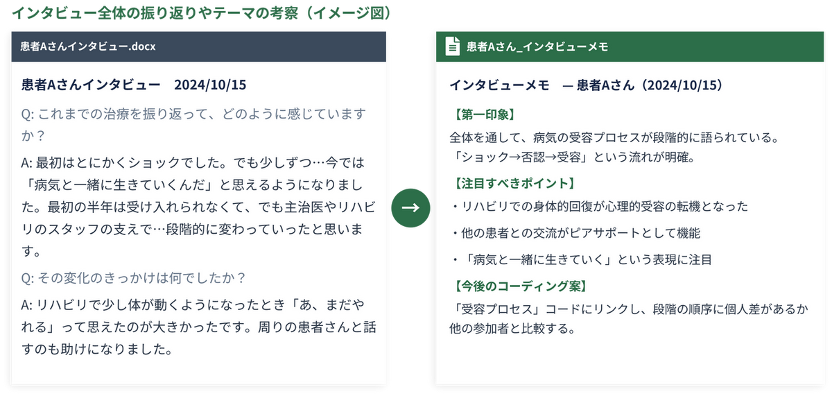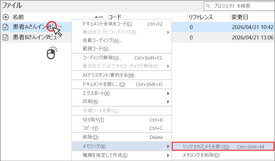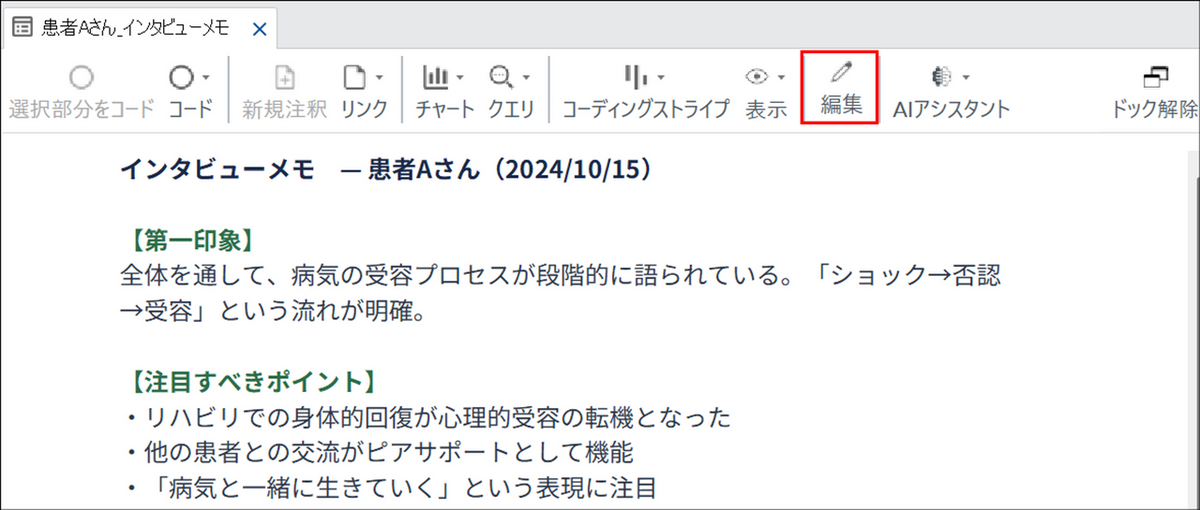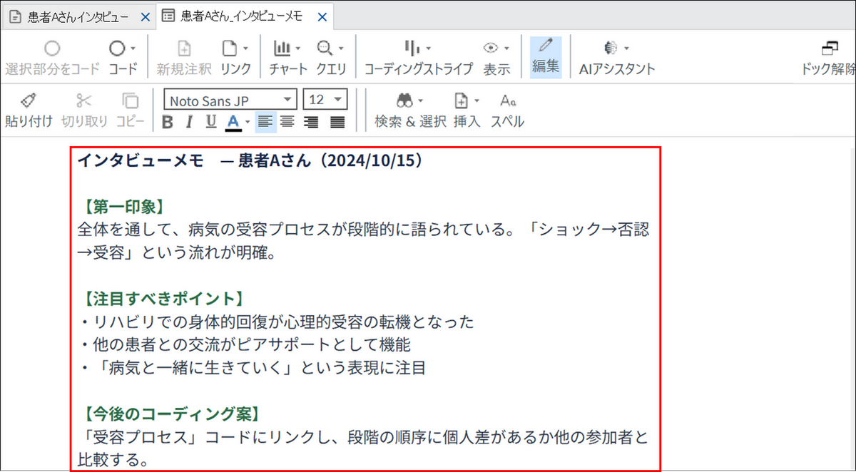 ある患者のインタビューを読み終えた直後に、そのファイルにリンクさせたメモを作成し、「全体を通して、病気の受容プロセスが段階的に語られている」といった第一印象や解釈を自由記述で記録します。また、特定のコードに対してメモをリンクさせ、そのテーマの意義やパターンを記述することもできます。例えば「受容プロセス」というコードにメモをリンクし、「このテーマは複数の参加者に共通して見られるが、段階の順序には個人差がある」といった考察を加えていくことで、そのテーマに関する自分の思考の蓄積を参照できるようになります。