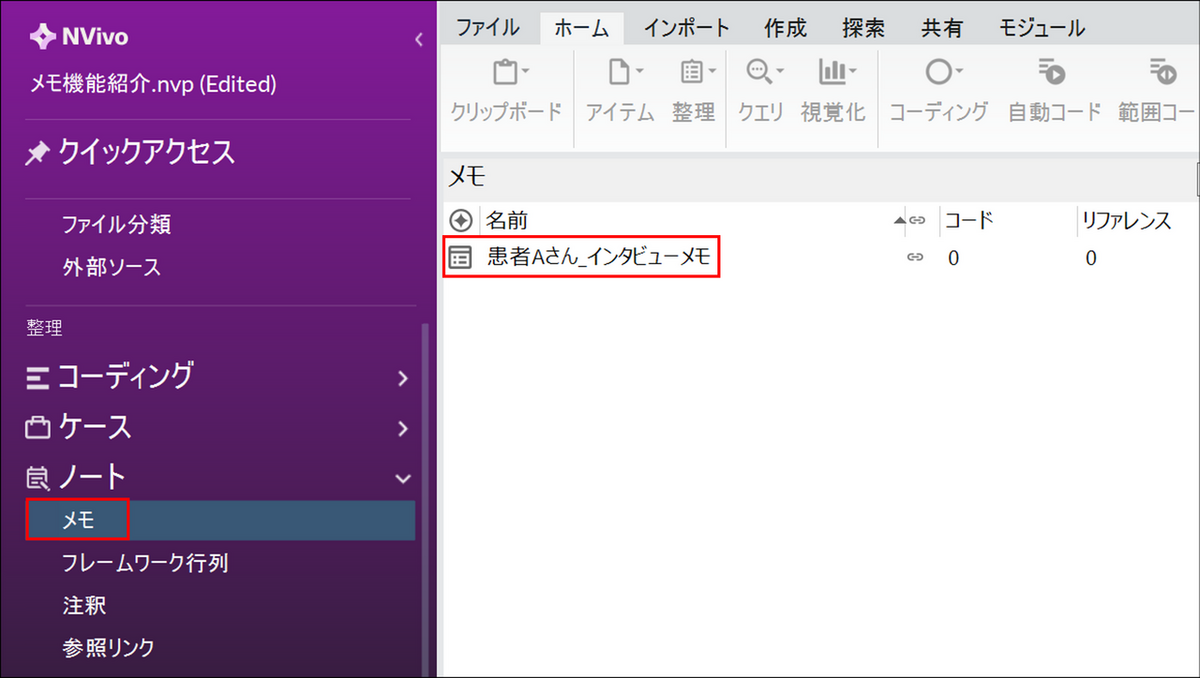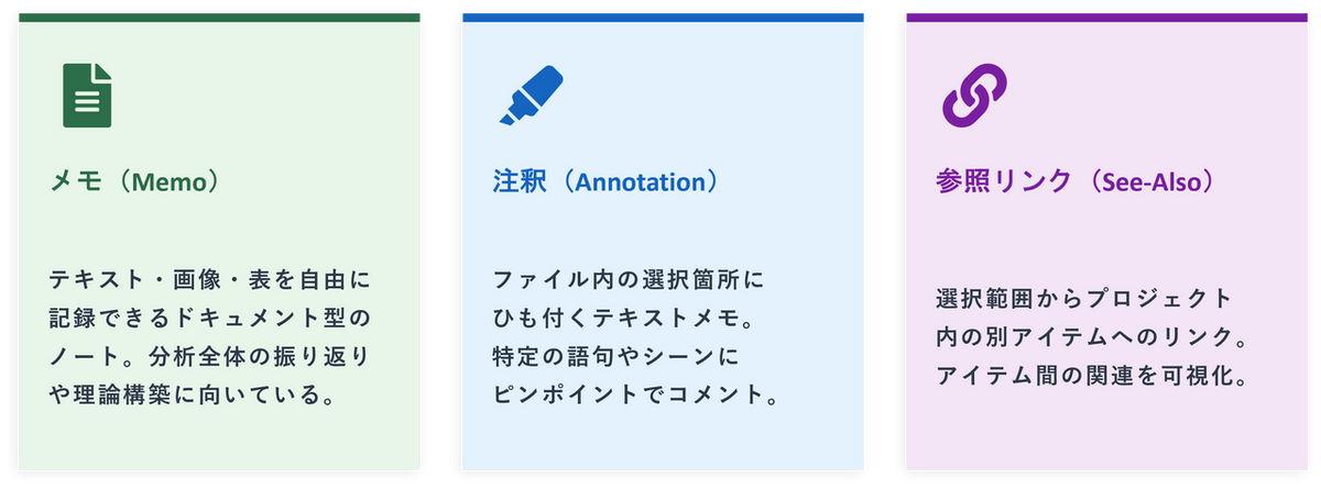 メモはプロジェクト内に作成する独立したドキュメントです。テキストの入力だけでなく、画像の挿入や表の作成も可能で、プロジェクトアイテムに対するアイデア、洞察、解釈、または深まりゆく理解を記録することができます。分析対象のデータとは切り離して思考を記録でき、最終的な執筆段階の重要な土台にもなります。メモはファイル・コード・ケース・外部ソースいずれか1つのアイテムとリンクさせることもできます。