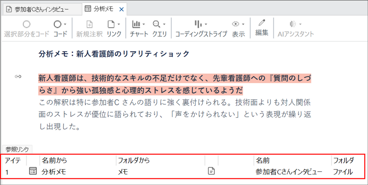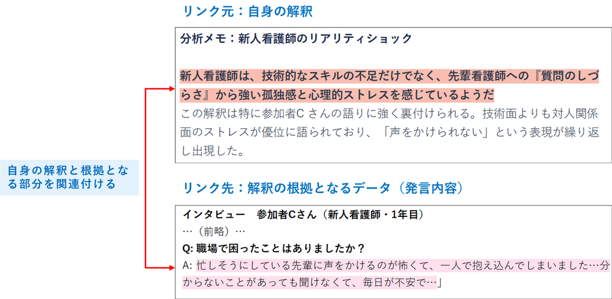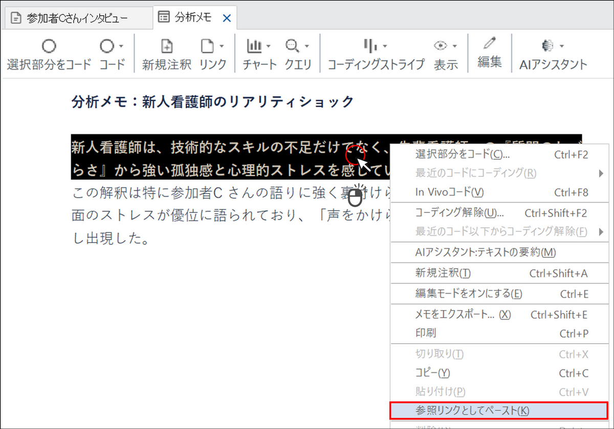 あなたは「新人看護師のリアリティショック」に関する分析を行っています。メモの中に「新人看護師は、技術的なスキルの不足だけでなく、先輩看護師への『質問のしづらさ』から強い孤独感と心理的ストレスを感じているようだ」という独自の解釈を記述しました。この解釈の裏付けとなる発言が、参加者 C さんのインタビューの中にあります。メモ側の解釈テキストを選択し、C さんのインタビューファイル内の該当発言(例:「忙しそうにしている先輩に声をかけるのが怖くて、一人で抱え込んでしまいました…」)へと参照リンクを貼ります。これにより、「なぜそう判断したのか」という根拠(エビデンス)をいつでも即座に確認でき、分析の透明性を保つことができます。後からリンクをたどるだけで解釈と根拠データを行き来できるため、論文執筆時や研究チームでの議論の際にも大きな助けとなります。