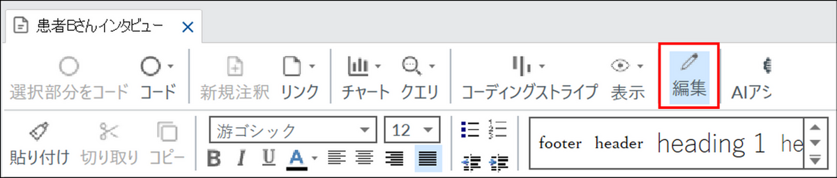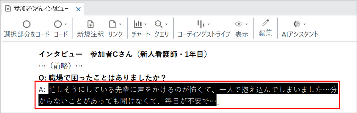 インタビューなどを開き、解釈の根拠となるテキスト範囲を選択してコピーします。