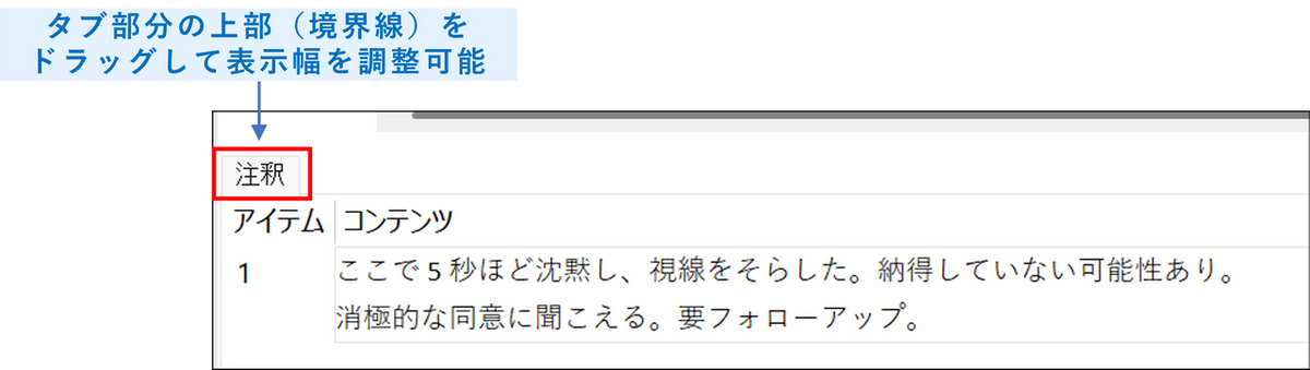 詳細ビューの下部に表示される「注釈」タブの領域は、タブ部分の上部(境界線)を上下にドラッグすることで、表示幅(高さ)を自由に調整できます。長文の注釈を読みたい場合や、ファイル内の複数の注釈を一度に一覧で確認したい場合に、領域を広げておくと視認性が上がり便利です。