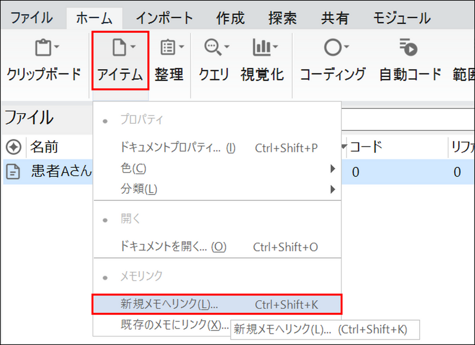 参照リンクは、ファイルやメモ内の選択範囲から、プロジェクト内のほかのアイテム(ファイル・コード・メモなど)や別のファイル内の特定箇所へと直接リンクを繋ぐ機能です。リンク元はハイライト表示され、ウィンドウ下部の参照リンクタブにリンク先が表示されます。異なるアイテム間の関連を明示的に記録することで、分析上の判断根拠を追跡可能にし、研究の透明性を保つことができます。