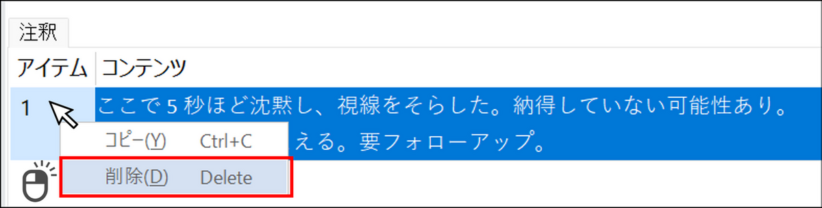 作成した注釈を削除したい場合は、詳細ビュー下部の「注釈」タブに表示されているリストから該当の注釈を選択し、右クリックメニューから[削除] を選択するか、キーボードの Delete キーを押します。