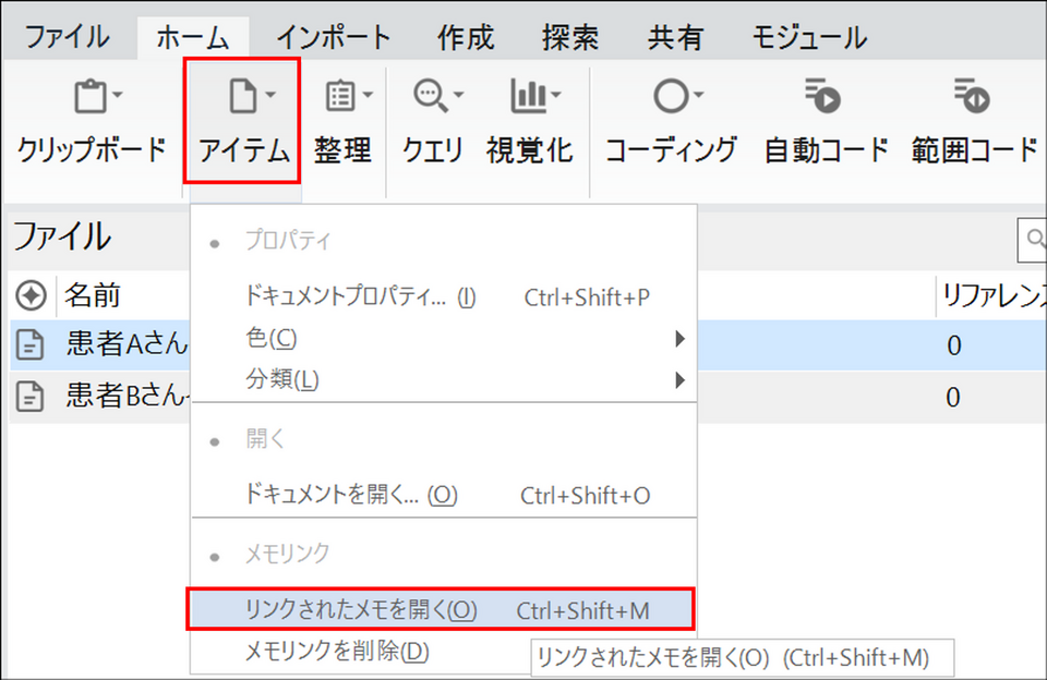 リストビュー上でメモがリンクされたアイテムを選択した状態で、メニュー[ホーム] タブの[アイテム] > [リンクされたメモを開く] を選択する。