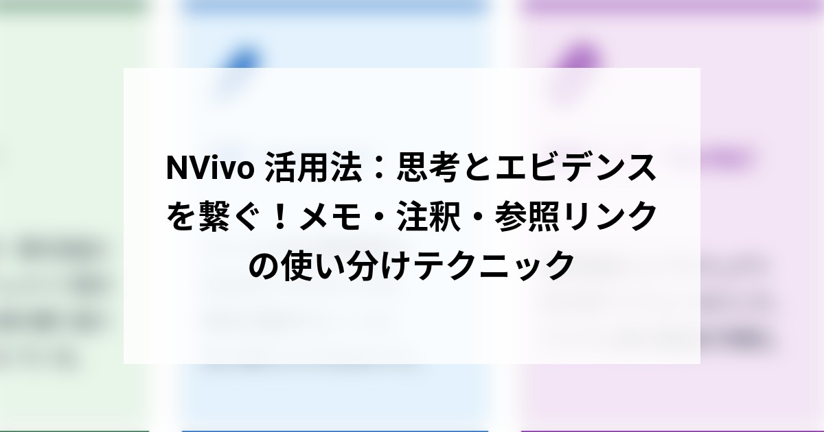 NVivo に備わっている3つのノート機能は、単独で使うだけでなく、組み合わせて使用することで最大の効果を発揮します。例えばインタビュー分析であれば、トランスクリプトを読み込みながら、沈黙や声のトーンといった気になる箇所に「注釈」で非言語情報を記録します。次に、インタビュー全体を通した印象や深まりゆく理解を「メモ」として自由に書き留めます。そして、そのメモ内に記述した独自の解釈から、根拠となるインタビュー内の具体的な発言へと「参照リンク」を貼り証拠(エビデンス)を直接結びつけます。このような流れで3つの機能を日頃から活用することで、単なるデータの分類(コーディング)にとどまらず、分析におけるご自身の思考プロセスをプロジェクト内に体系的に蓄積することができます。結果として、どのように理論を構築していったのかを後から容易に追跡できるようになり、研究の透明性と信頼性を大幅に高めることにつながります。コーディングと並行して、こまめに思考のノートを取る習慣をぜひ身につけてみてください。