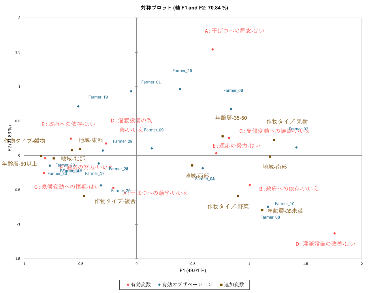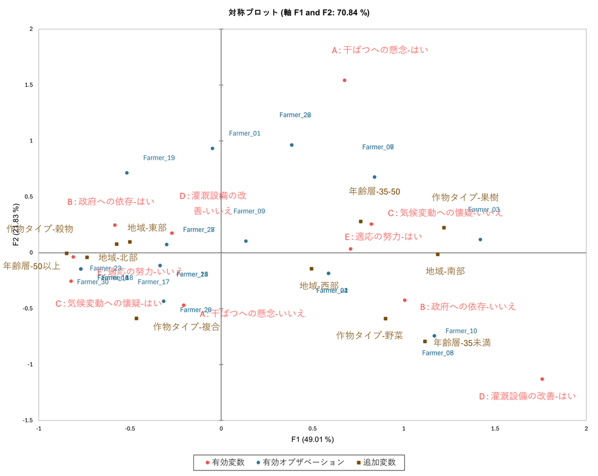 多重コレスポンデンス分析を実行すると、結果に「対称プロット」と呼ばれる散布図が得られます。この図を読み解くことで、農家の類型化が可能になります。