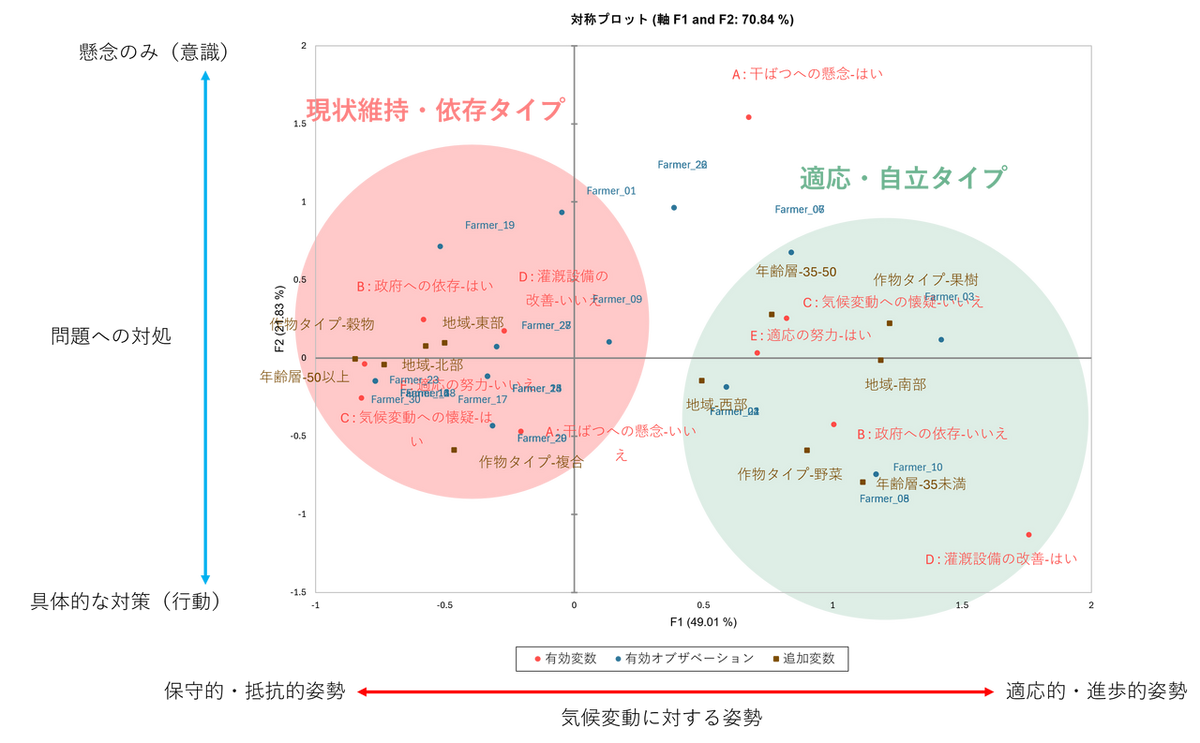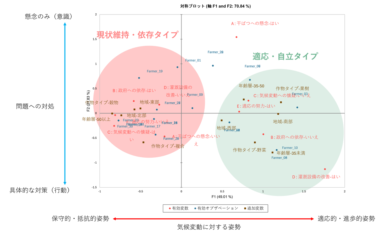 - 意識:「適応への努力」や「灌漑設備の改善」といった変数と強く結びついており、能動的に気候変動対策を行っていることが分かります。