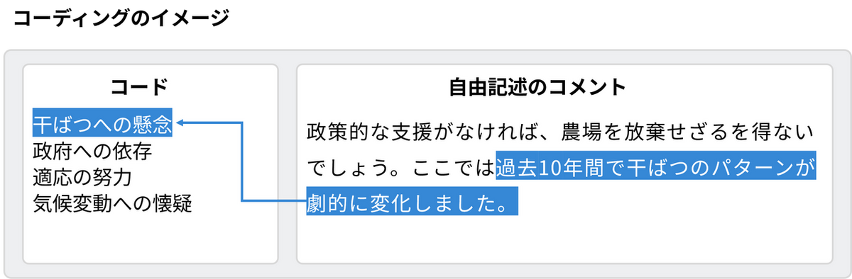 データセットのインポートが完了したら、構造化されていない自由記述のコメントを「コーディング」という手法で分析します。これはテキストデータの中から意味のある箇所を抜き出し、「コード」と呼ばれるラベルを付ける作業です。