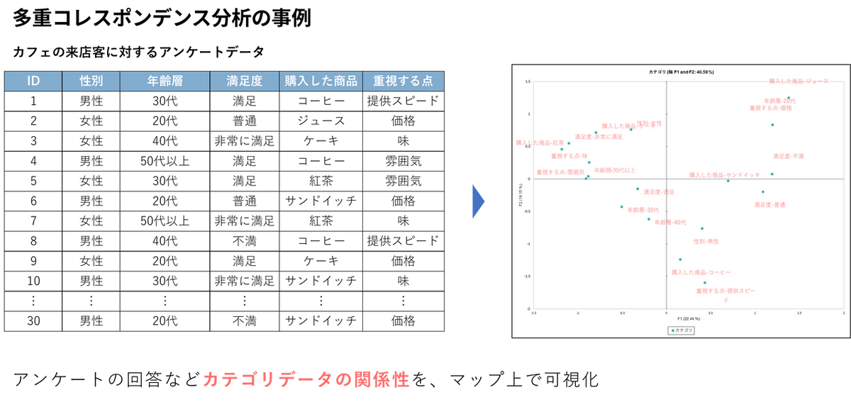 次に、データの背後にある「隠れた構造」を明らかにするために、多重コレスポンデンス分析を実行します。多重コレスポンデンス分析とは、アンケートの回答パターンのような「カテゴリカルデータ(質的変数)」の関係性を、2次元マップ上に可視化する手法です。似ている項目は近くに、関係が薄いものは遠くに配置されるため、データの背後にある隠れたグループや傾向を直感的に発見できます。