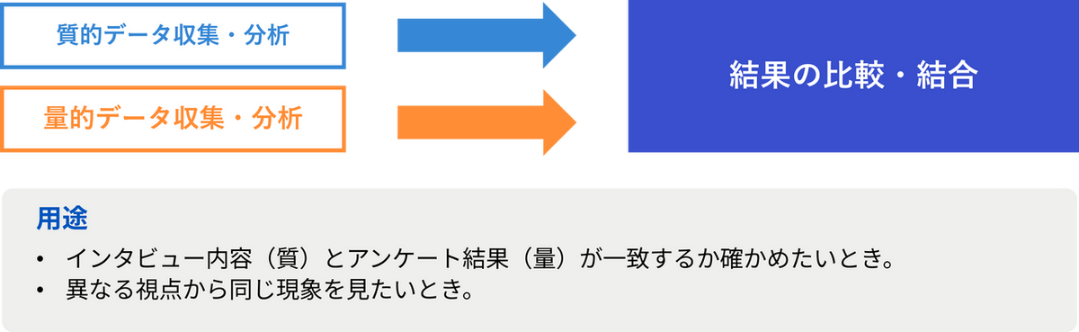 定性と定量のデータを同時に収集・分析し、結果を比較・統合する手法。