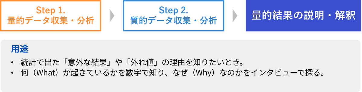 まず量的分析を行い、その結果(外れ値や意外な結果など)を詳しく理解するために質的分析を行う手法。