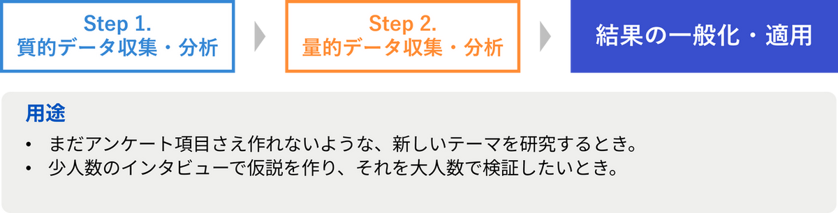 まず質的分析でテーマや仮説を生成し、その後に量的分析でその一般性を検証する手法。