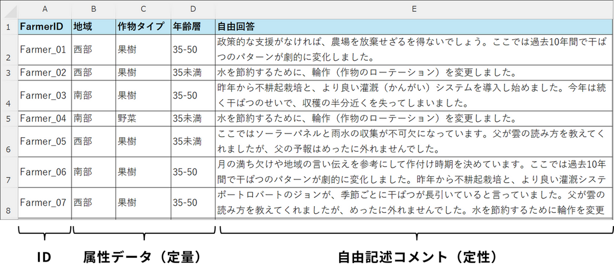 各農家(行)が各テーマ(列)に言及している箇所数が表示された表が生成されます。