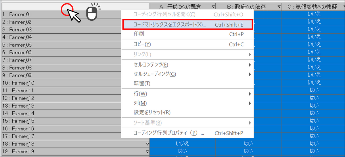 行列コーディング結果の上で右クリックし、[コードマトリックスをエクスポート] を選択します。