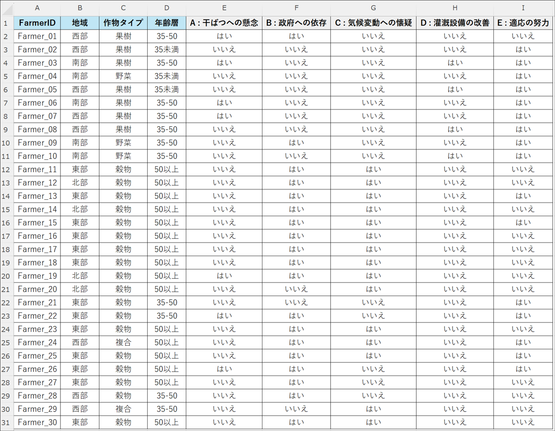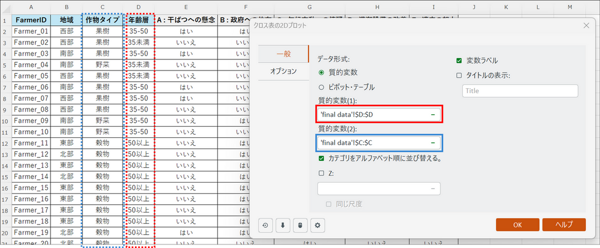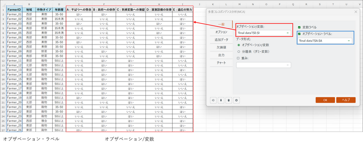 分析に使用するデータ列(「A : 干ばつへの懸念」、「B : 政府への依存」、 「C : 気候変動への懐疑」、「D : 灌漑設備の改善」、「E : 適応の努力」の列)を選択します。 - 変数ラベル:チェックを入れます。