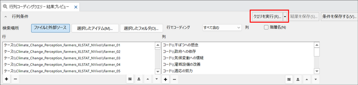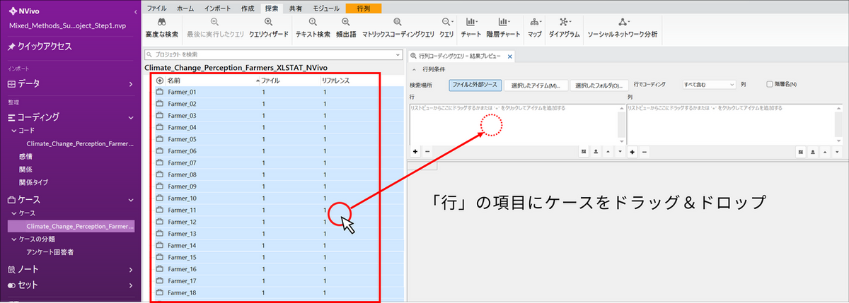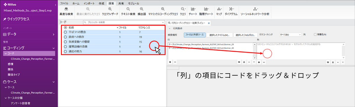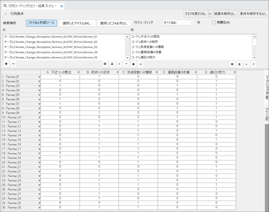 自由記述コメントのコーディングが完了したら、NVivo で抽出した「テーマ」を、XLSTAT で分析するために「数値データ」に変換します。具体的には、マトリックスコーディングクエリ機能を利用し、農家ごとに、あるテーマについて言及していれば「はい」、していなければ「いいえ」というバイナリ変数の表を作成します。