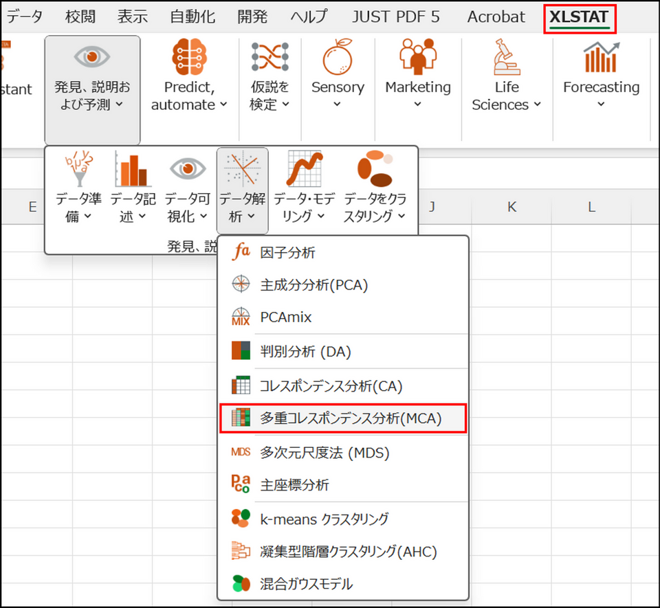 XLSTAT を起動し、[発見、説明、および予測] > [データ解析] > [多重コレスポンデンス分析(MCA)] を選択します。