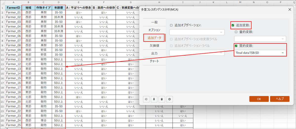 [追加データ] タブに切り替え、[追加変数] と[質的変数] の項目にチェックを入れ、属性(「地域」、「作物タイプ」、「年齢層」)の列を選択します。