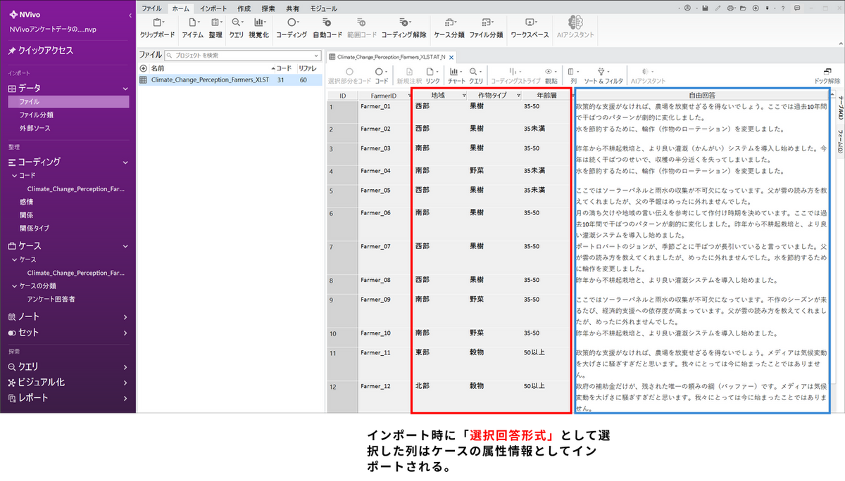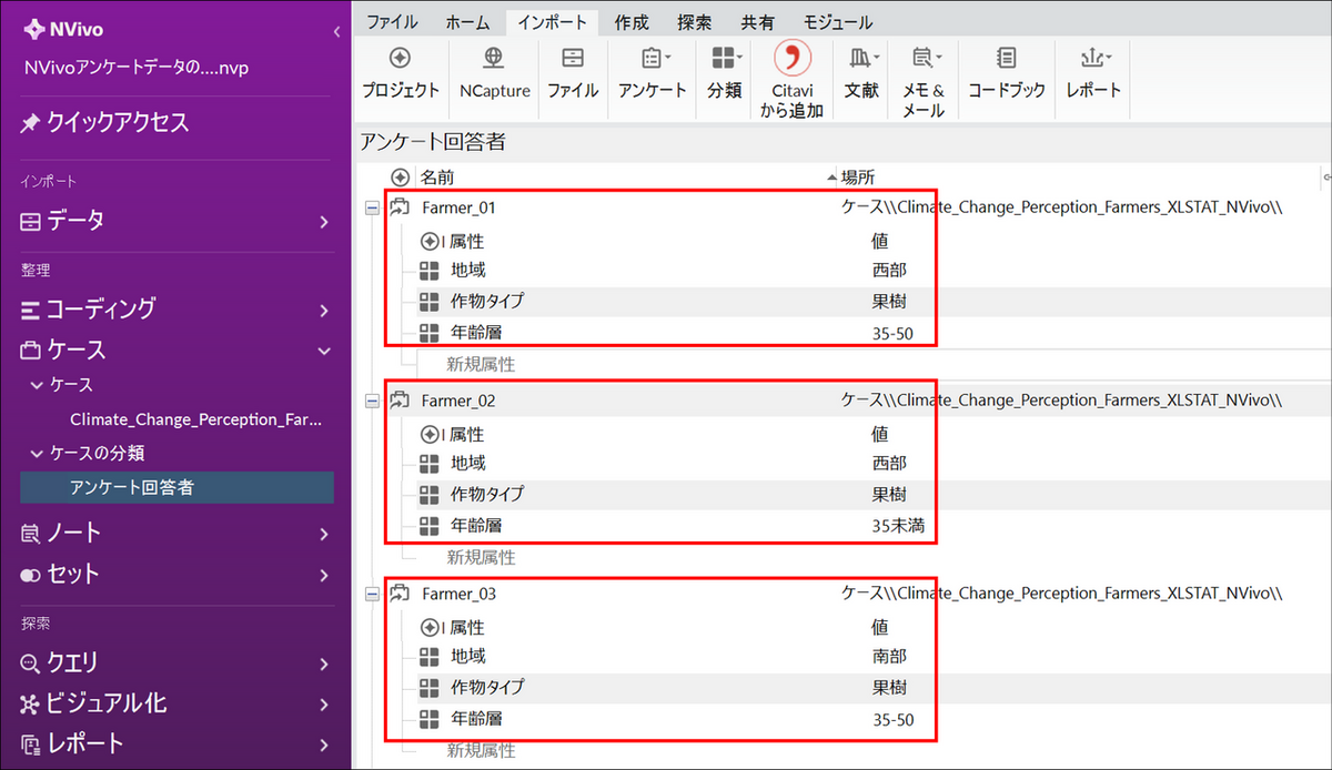まずはデータセットをNVivo のプロジェクトファイルにインポートします。NVivo Windows 版ではExcel 形式のデータをインポートすると、対象者(ID)ごとにケースが自動的に作成されます。また、各ケースには属性情報が付与されています。