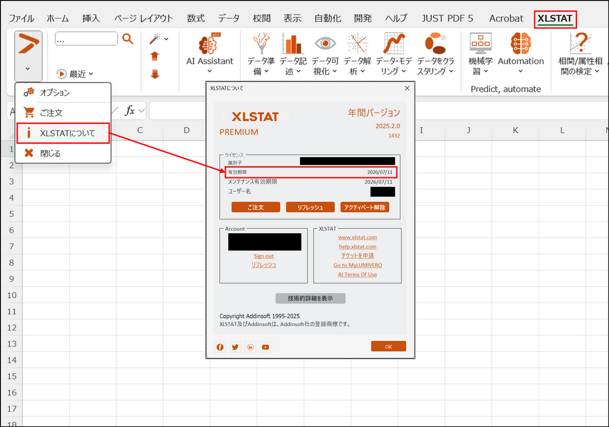 [XLSTAT] タブ内の [メニュー] をクリックし、[XLSTAT について] を選択