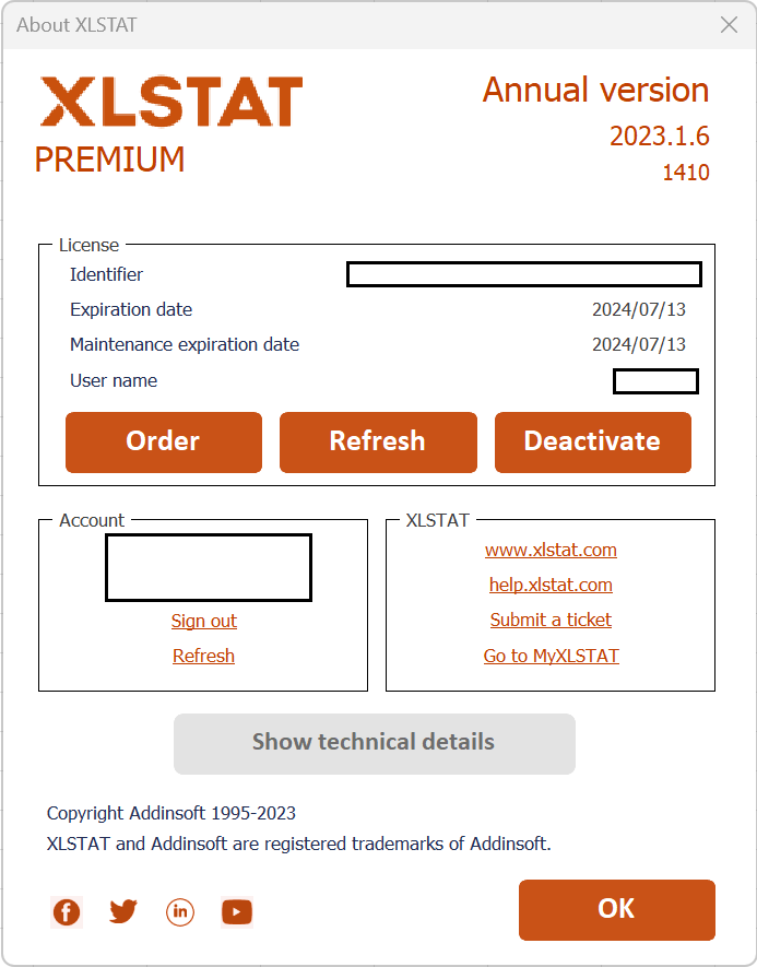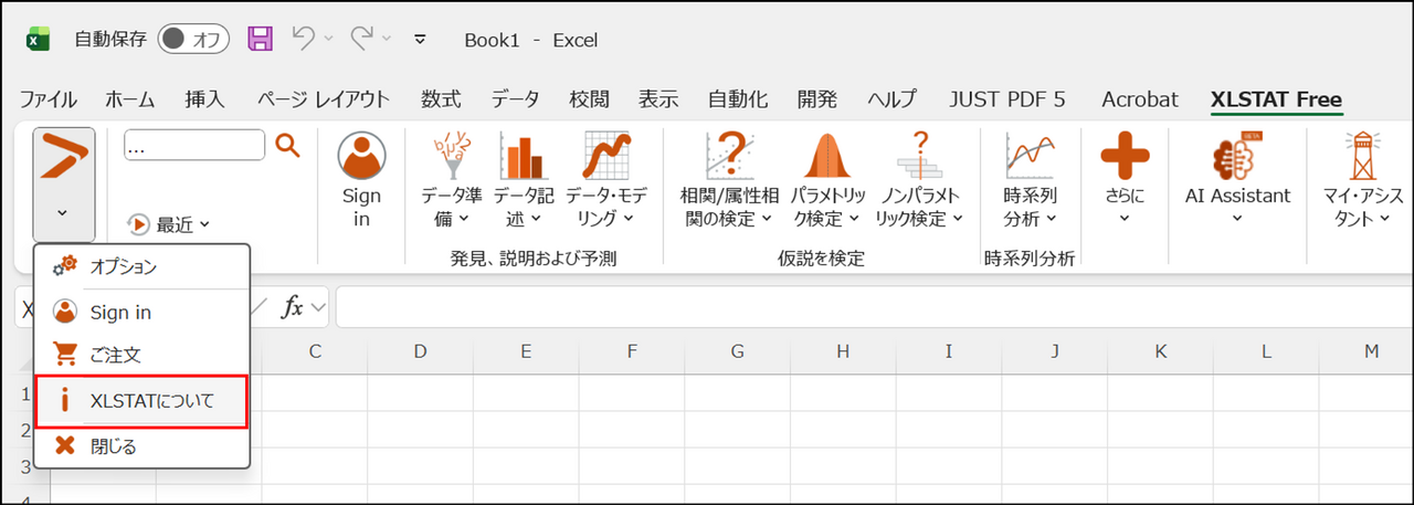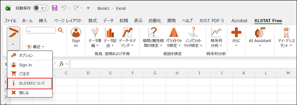[XLSTAT] メニュー内の[メニュー] をクリックし、[XLSTATについて] を選択