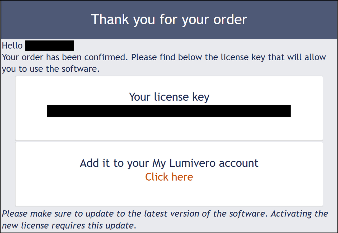 注文確認メール本文にある「Add to your My Lumivero account」(MyLumivero アカウントに追加)セクションの、「Click here」(ここをクリック)というリンクをクリック