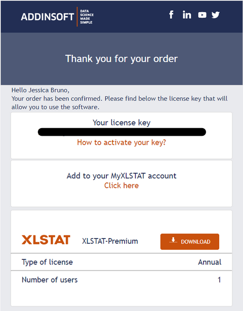 XLSTAT ライセンスをご購入後、Lumivero から以下のような注文確認メールが届きます。