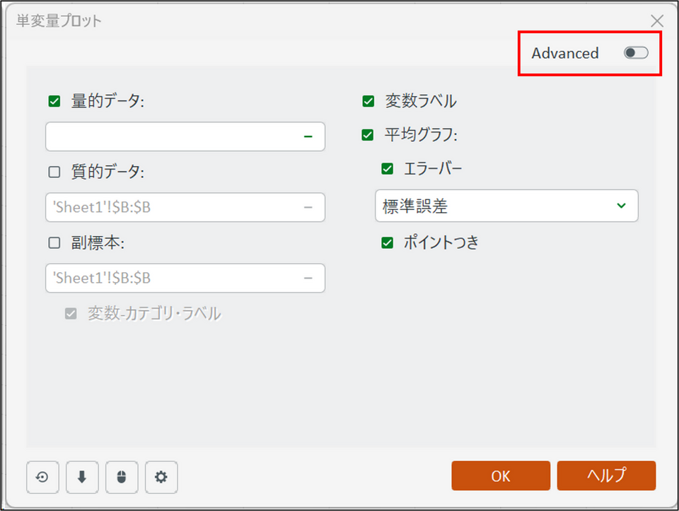 XLSTAT の各分析機能のダイアログボックス(設定画面)には、初心者の方向けに表示をシンプルにする機能が備わっています。そのため、「使いたいオプションが見当たらない」「マニュアルやチュートリアルに載っているタブがない」という場合があります。すべての高度な機能や詳細なオプションを表示するには、「Advanced(詳細)」オプションを有効にしてください。