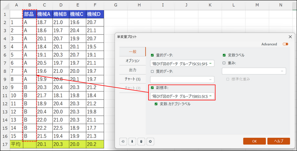 操作手順は通常の箱ひげ図の作成と同様ですが、データ選択時に[副標本:] の項目にチェックを入れ、部品の列を選択します。