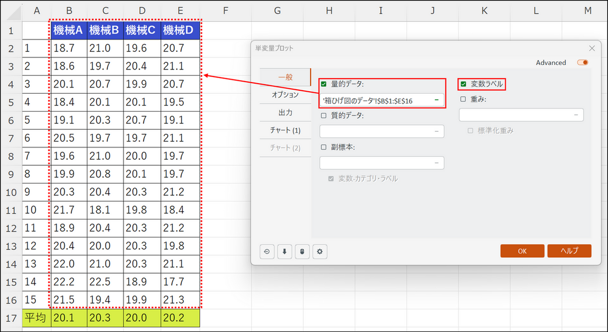生産された部品の寸法の平均はいずれの機械も20 mm 程度で、どの機械で生産しても大きな差はないように見えます。もしあなたがこの工場の責任者でどの機械を導入するか検討している場合、このデータの平均値にだけ着目すると、より価格が安い機械を選択したくなるかもしれません。しかし、製造現場において、目標とする寸法の部品を安定的に生産するためには、平均値だけでなく、データのばらつきを考慮することが重要です。このような場面で役に立つのが冒頭にご紹介した箱ひげ図です。このページでは上記データを用いて、XLSTAT で箱ひげ図を作成する方法をご紹介します。