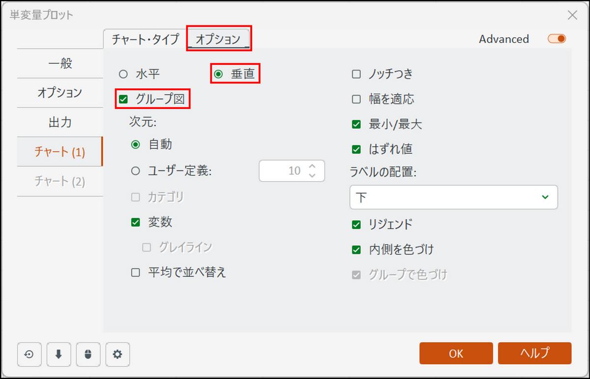 [チャート(1)] > [オプション] タブに切り替え、下記項目を指定します。