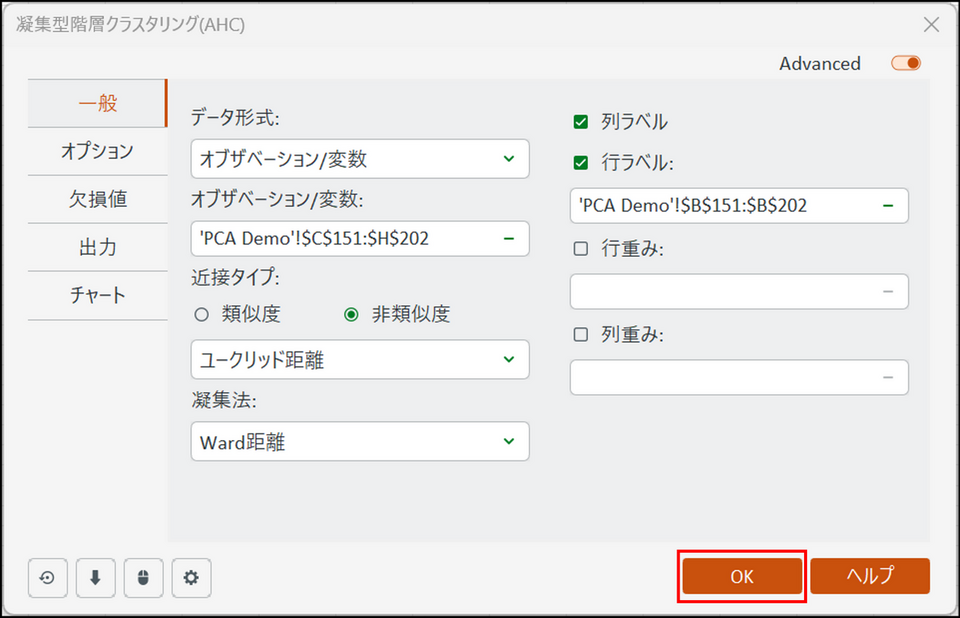 このボタンをクリックすると、ダイアログボックスが自動的に開きます。凝集型階層的クラスタリングを実行するにはOK ボタンをクリックします。