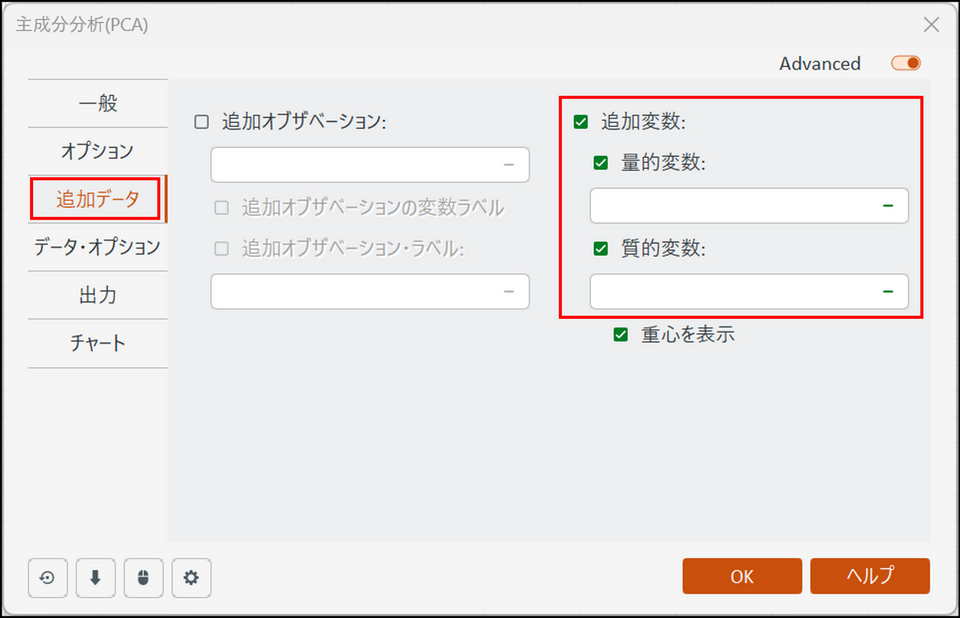 主成分分析を実行した後に、補助変数を追加することも可能です。これは解釈の質を高めるのに役立つ可能性があります。XLSTATでは、それらの変数は、ダイアログボックスの[追加データ] タブで選択できます。補足変数は、2つのタイプに分けられます。