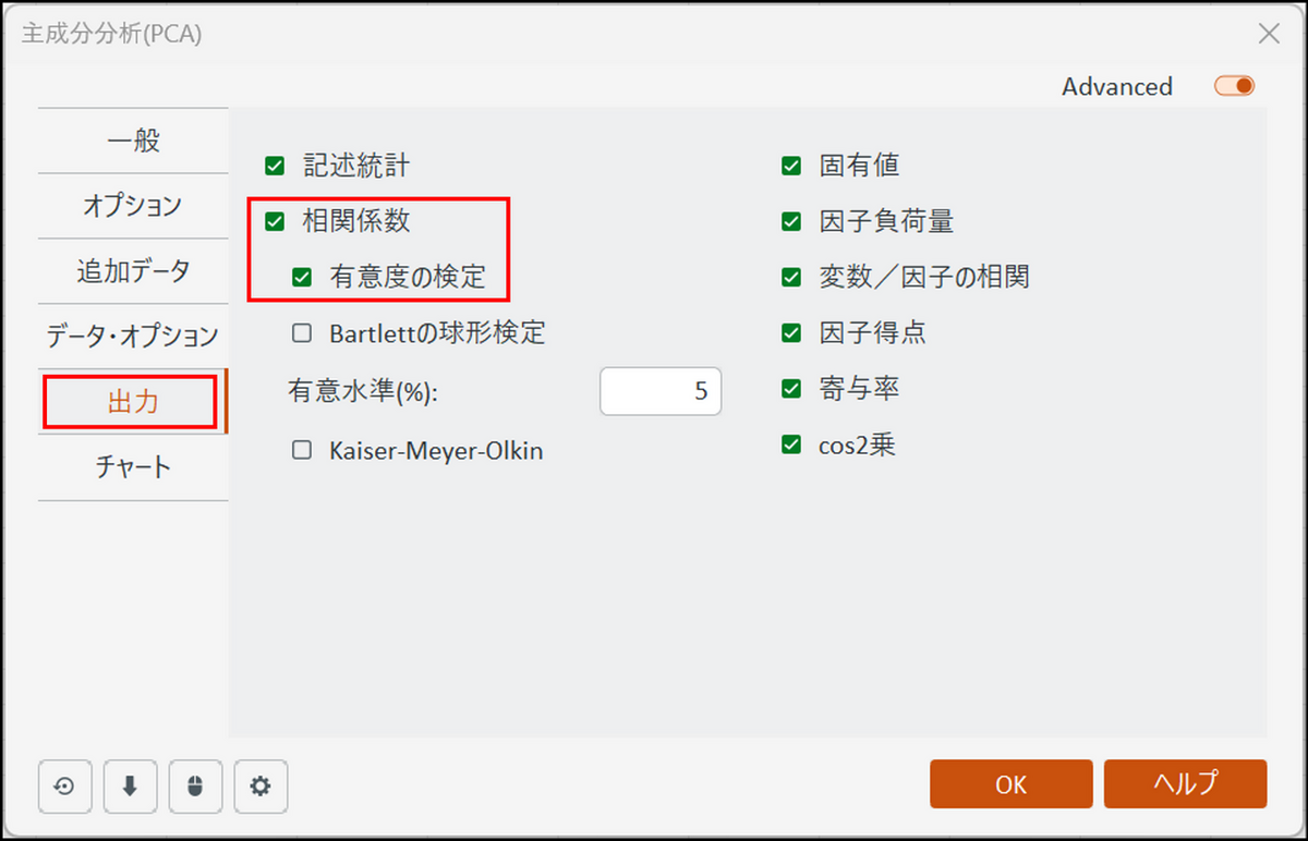 [出力] タブに切り替え、[相関係数] と [有意度の検定] にチェックを入れておきます。