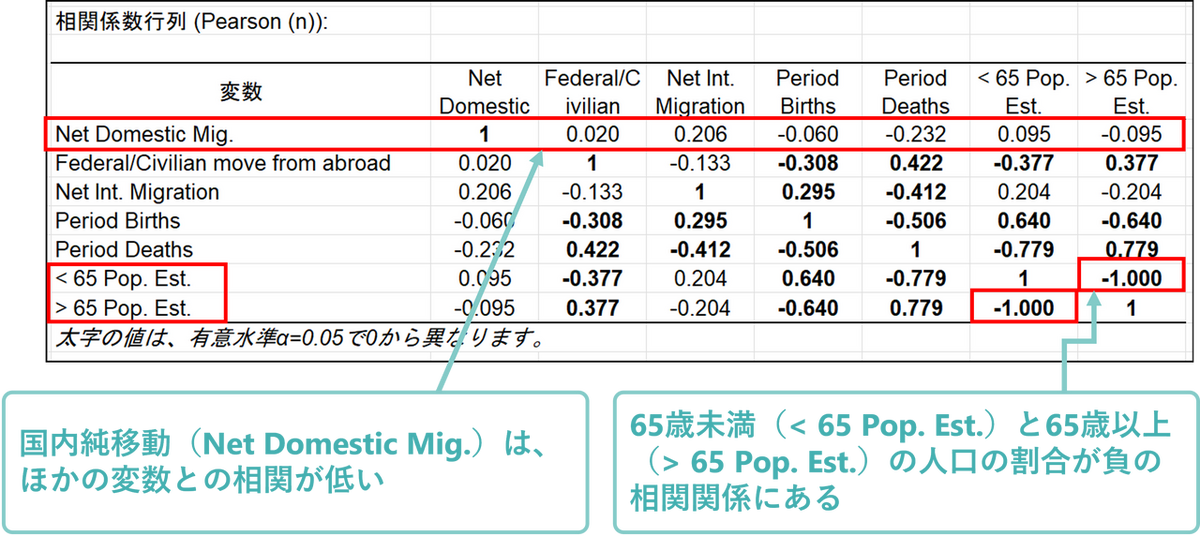 最初に見るべき結果は相関行列です。相関行列を確認すると、65歳未満(< 65 Pop. Est.)と65歳以上(> 65 Pop. Est.)の人口の割合が負の相関関係にあることがすぐにわかります(r = -1)。つまり、どちらかの変数を削除しても、分析結果に大きな影響はありません。また、国内純移動(Net Domestic Mig.)は、国際純移動(Net Int. Migration)を含む他の変数との相関が低くなっています。これは、米国人と非米国人では、移住の理由が異なる可能性を示唆しています。