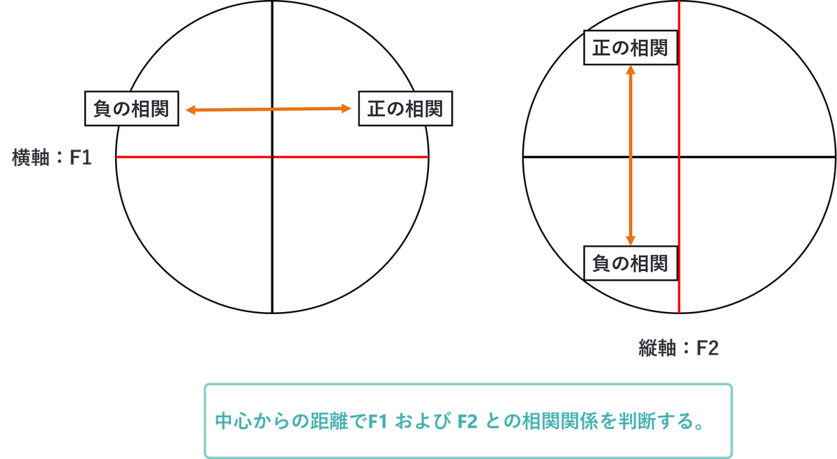 この図における解釈として、まずは矢印の距離を確認します。矢印が円の中心から遠くに伸びている場合、その変数は因子(F1/F2)と強い関連があります。左右の横軸方向に長く伸びていれば、F1 との関連が強く、上下の縦軸方向に長く伸びていればF2 との関連が強いことを示しています。また、下記の図のように伸びている方向により正負どちらの相関があるのかを判断することができます。