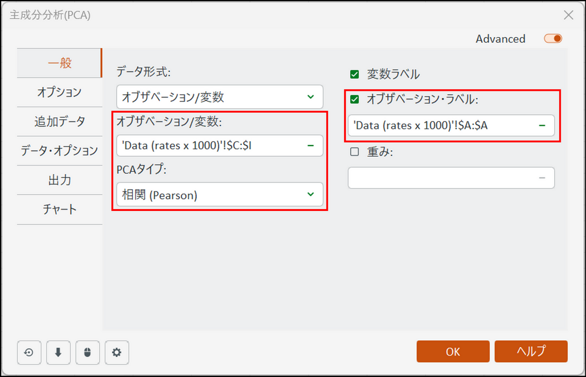 分析対象の変数ラベルが記録されているセルを選択します。今回の場合は、州の名前が入力されているA列を選択します。 - [PCAタイプ]: