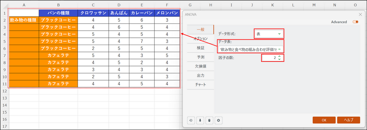※因子名(「飲み物の種類」と「パンの種類」)のセルも含めて選択します。 - 因子の数:今回因子の数は2つなので、「2」と入力。