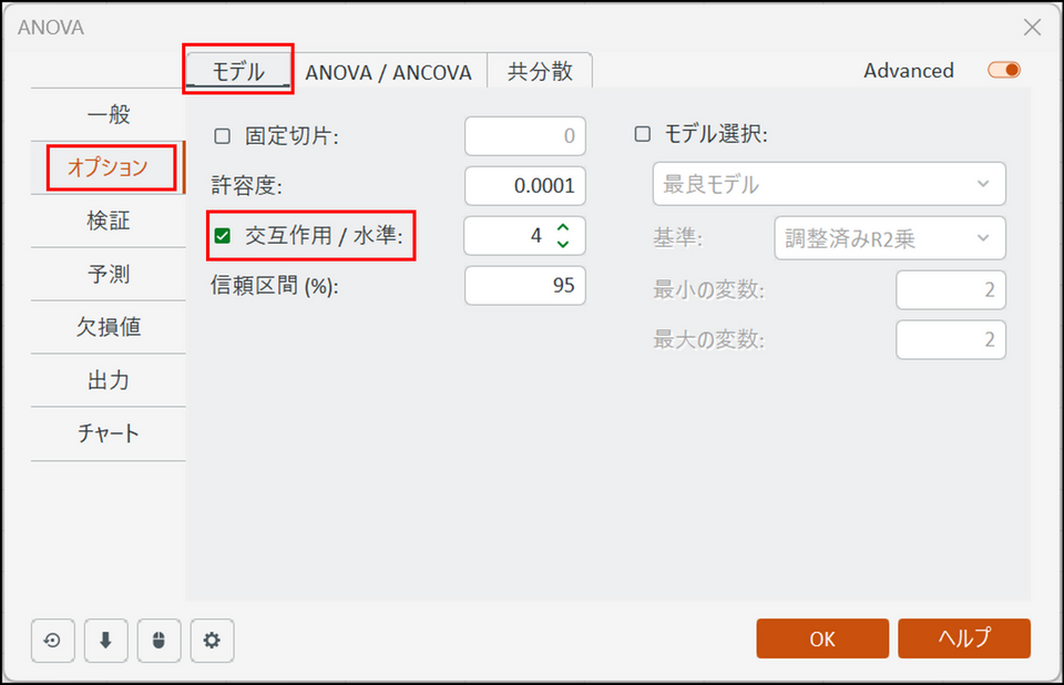 [オプション] > [モデル] タブに切り替え、[交互作用 / 水準] の項目にチェックを入れます。
