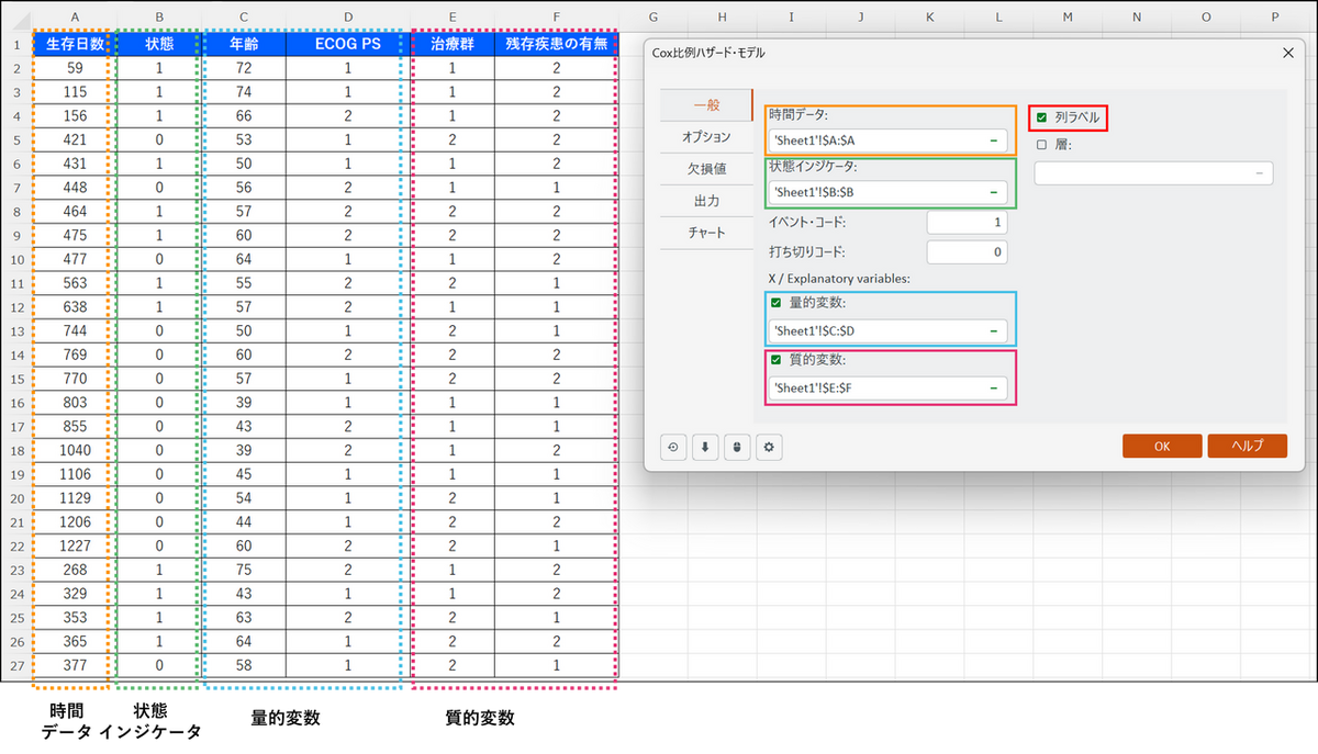 XLSTAT でCox 比例ハザードモデルを実行するためには、以下のデータが必要です。