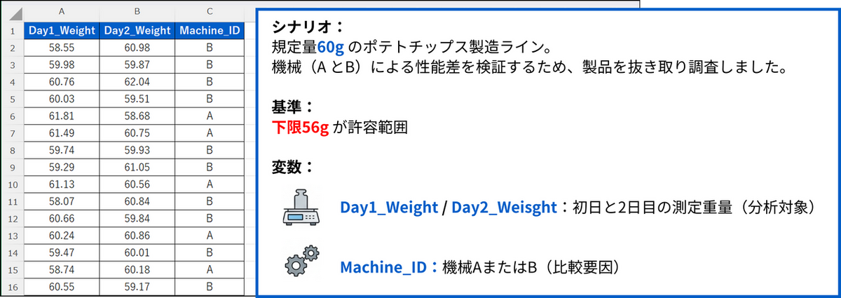 今回は「ポテトチップス工場の充填工程」を想定したデータを使用します。規定量(60g)の製品を製造ラインからランダムに抜き取り、重量を測定しました。このデータを用いて、機械ごとの性能差を検証します。