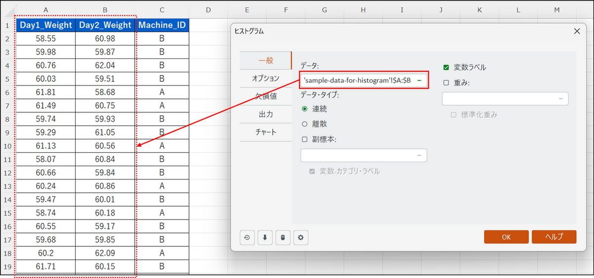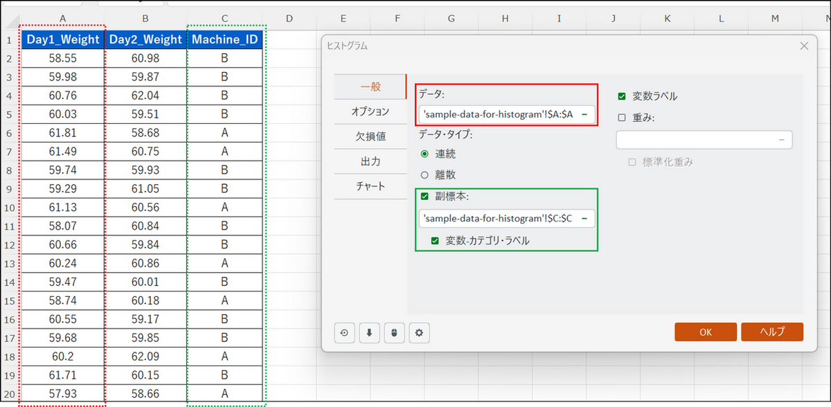 [一般] タブのデータ項目にて、Day1_Weight 列のみを選択します。また、[副標本] 項目にチェックを入れ、Machine_ID の列を選択します。