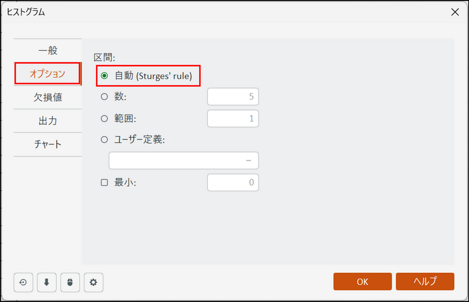 [オプション] タブに切り替え、ヒストグラムの棒の本数を指定します。今回は[自動 (Sturges’ rule)] を選択します。こちらのオプションを選択することで、データ数に応じて最適な数を自動計算します。