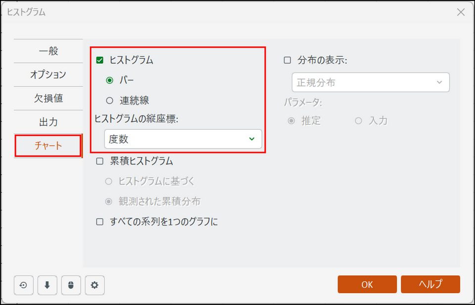 [チャート] タブに切り替え、[ヒストグラムの縦座標] 項目で[度数] を選択します。