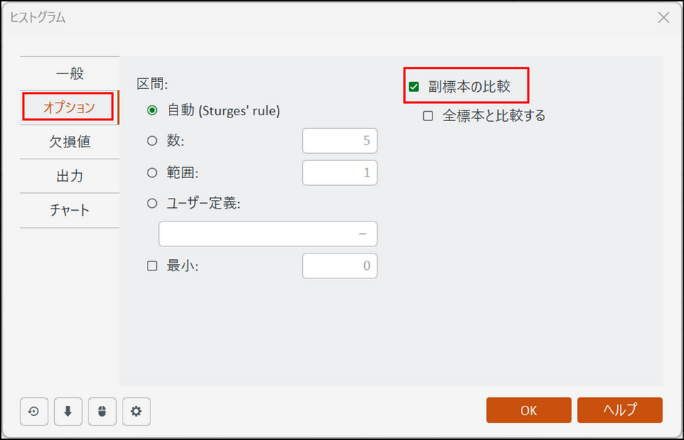 [オプション] タブに切り替え、[副標本の比較] 項目にチェックを入れます(これにより2つの機械のヒストグラムを重ねて比較できます)。
