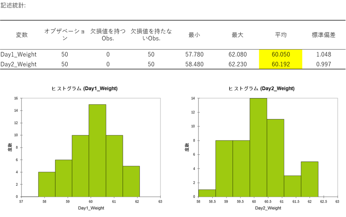 記述統計を確認すると、1日目の平均は60.05g、2日目の平均は60.19g です。大きな差はなく、どちらも規定量(60g)付近で製造できているように見えます。ヒストグラムも正規分布に近い形をしており、極端な異常値も見当たりません。