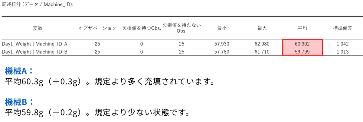 記述統計の表では機械ごとに平均値、最小値、最大値、標準偏差などの情報を確認することができます。今回の結果では、機械 A の平均値は 60.30g となっています。規定量が60g なので、平均して0.3g 多く充填されていることが分かります。一方、機械B の平均値は 59.80g です。わずかではありますが、こちらは規定量の60g を下回っています。お客様の手元に届く商品の平均が規定量不足というのは、品質管理上好ましくありません。