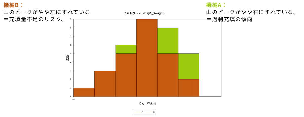 ヒストグラムでは2つの機械のグラフが重なって表示されます。ここでは各機械の「山(ピーク)の位置」のズレに注目してください。
