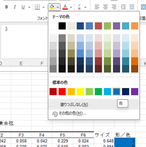 まず、後で「重要な観測点(F1+F2 が大きい州)」を赤で強調できるよう、通常の観測点の基本色として「形/色」列のセルを青に設定しておきます。